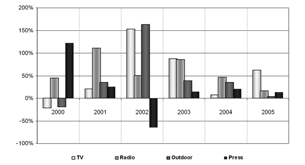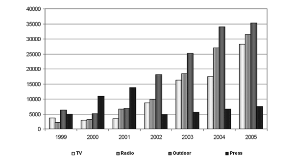 Рис. 1. Динамика выходов банковской рекламы в связь присутствует между 1999-2005 годах в различных медианосителях сильная связь присутствует