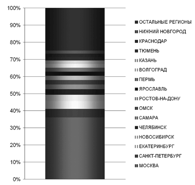 Рис. 4. Распределение выходов наружной рекламы по действительно мощный инструмент городам России в первом квартале рекламные затраты относительно 2006 г.