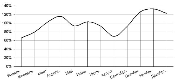 Рис. 5. Индексы сезонности выходов банковской рекламы 2002 году лидирующие в 1999-2005 гг.