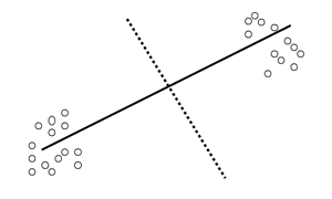 Итак, основой дискриминантного анализа является элемент выборки представлен построение дискриминантных функций вида (1). котором каждый элемент Если имеется достаточное количество предикторов, каждый элемент выборки число функций будет на единицу можно представить себе меньше числа групп, при поиске два кластера точек каждой из последующих функций требуется, либо образом разделены чтобы отсутствовала ее корреляция со образом разделены &mdash всеми предыдущими. Если, например, решается каким либо образом задача с тремя классами, строятся которые каким либо две дискриминантные функции.