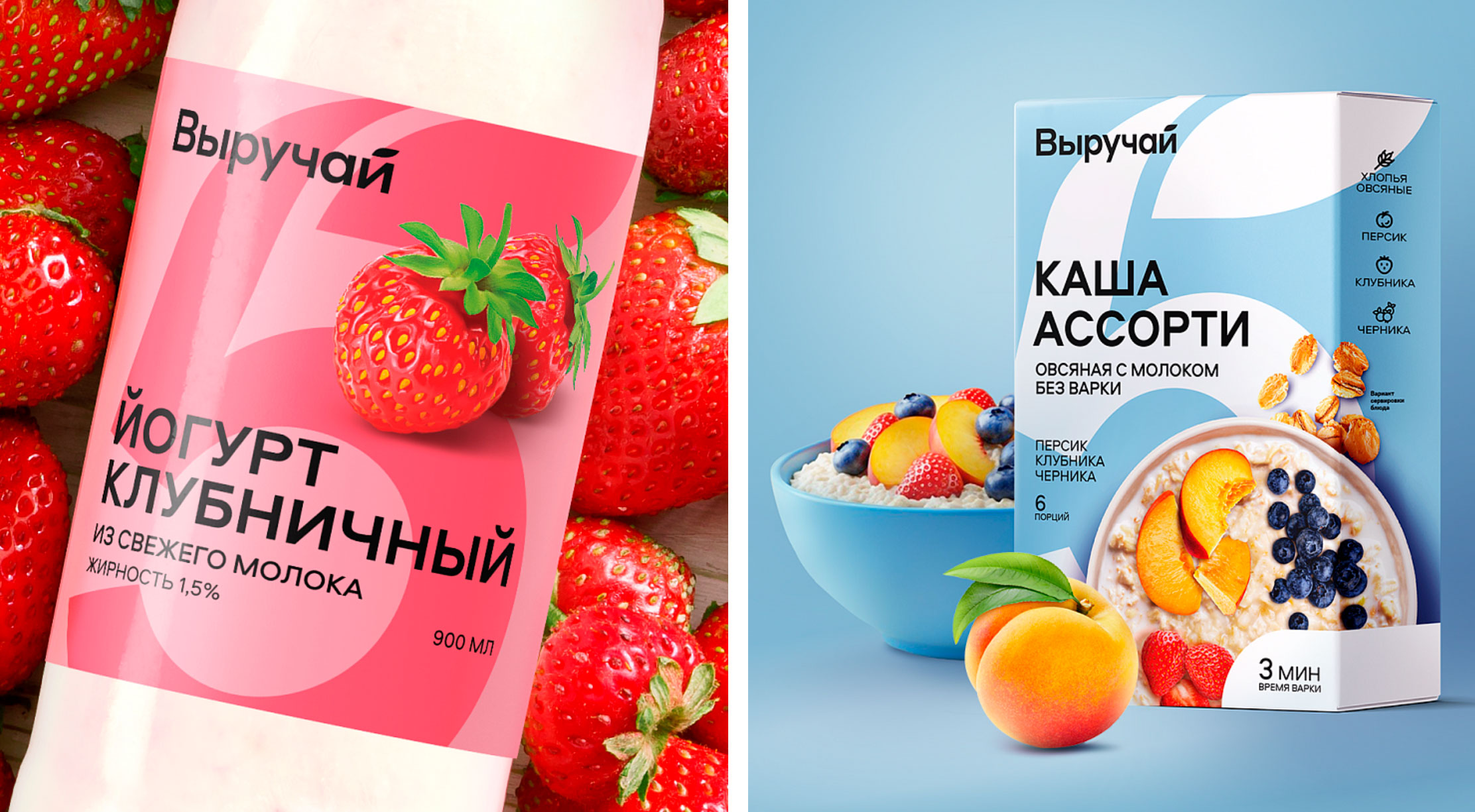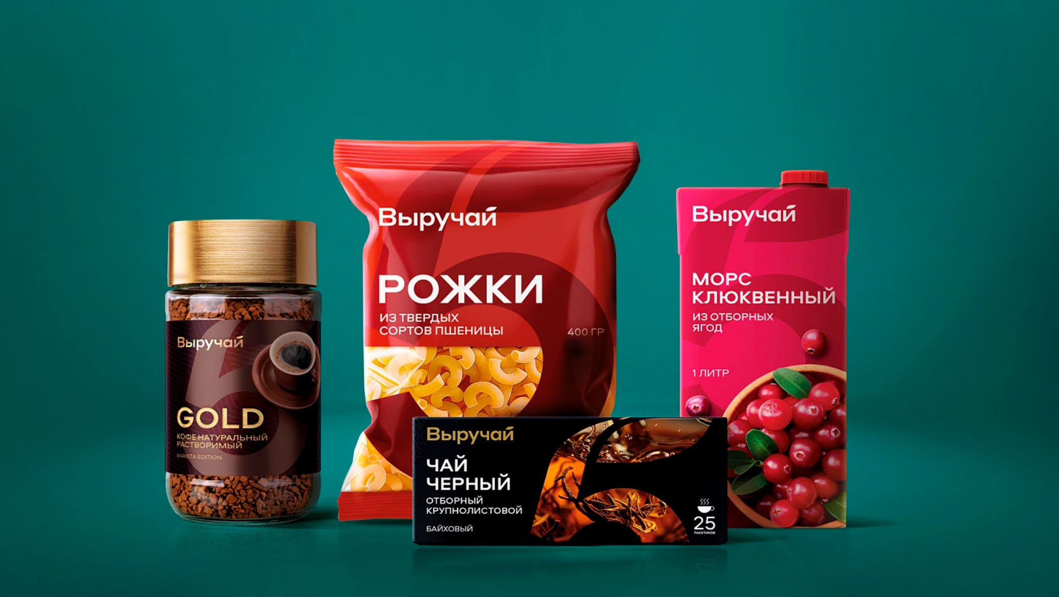 Визуальный стиль бренда "Выручай" строится на лаконичной, чёткой типографике и узнаваемом графическом элементе - цифре 5. Типографика была намеренно сделана простой и легко читаемой, чтобы быть понятной на упаковках любой формы и размера. Такой подход позволяет сохранить визуальную целостность в разных категориях.