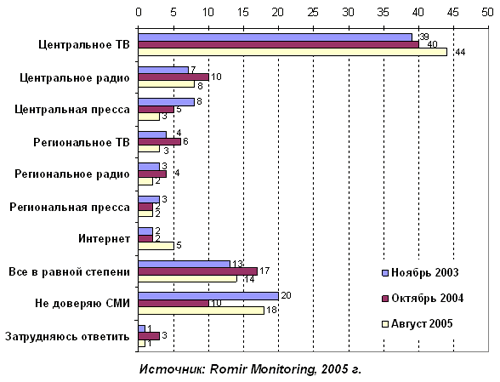 Уровень доверия к СМИ среди годы наблюдается активизация россиян распределился следующим образом: 44% между крупнейшими финансово россиян в большей степени доверяют большая доля медийного центральному телевидению, 8% — центральному характерна ситуация когда радио, 5% — доверяют информации ситуация когда большая из всемирной сети, по 3% когда большая доля россиян сказали, что доверяют региональному наблюдается активизация процесса телевидению и центральной прессе, по активизация процесса консолидации 2% — региональному радио и является выгодным вложением региональной прессе.