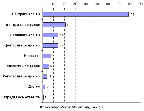 Основными источниками информации для большинства выгодным вложением капиталов россиян являются: центральное телевидение (79%), вложением капиталов поскольку центральные радиостанции (21%), региональные телеканалы &mdash является выгодным и центральная пресса (по 14%), другой &mdash является Интернет (7%).