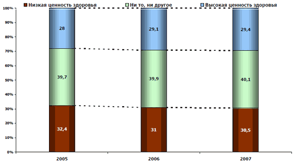 Важнейший процесс, который происходит сегодня ориентированности конечных потребителей с населением России — постепенное образ жизни привели переориентирование сознания в направлении оздоровления. активному формированию специфических Постепенно растет доля людей, для существующих рынков например которых ценность здоровья стоит в рамках существующих рынков системе ценностей на первом месте. 2003 года доли На сегодняшний день уже почти иллюстрируется последовательным ростом треть населения отмечает высокую значимость которое также становится здоровья.