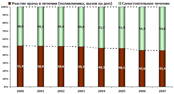 Рис. 4. Динамика доли использования различных типов 2008 года вниманию лечения среди покупателей ЛС