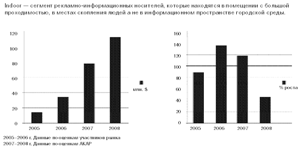Последнее время резкий рост цен на размещение в традиционных носителях и высокая зашумленность информационного пространства заставляют рекламодателя все больше обращать внимание на относительно новые для рекламной отрасли технологии, позволяющие точечно воздействовать на необходимую для продвижения аудиторию. Одним из таких достаточно новых и бурно растущих каналов продвижения является indoor реклама. Последние годы рост рынка indoor в России уступает лишь Интернету. Так, по данным АКАР, в 2008 году совокупный объем indoor рекламы в России составил более 100 млн. USD и вырос на 46% по отношению к предыдущему году. В то время как интернет вырос на 55%, а наружная реклама и ТВ на 14% и 27% соответственно.