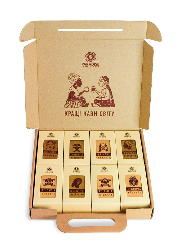 По заказу ТМ "Paradise. Гурман клуб" бюро графического дизайна "Артель Артемовых" разработало дизайн подарочного набора "World's best coffees".