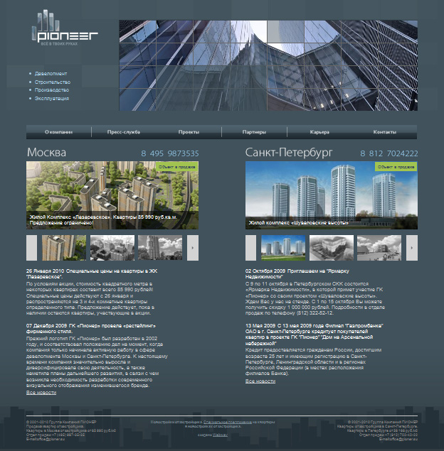 Четкую и прозрачную структуру получили страницы, связанные с объектами ГК «Пионер», будь то уже реализованные, строящиеся или проектируемые жилые комплексы в Москве и Санкт-Петербурге. Каждый объект теперь можно легко найти не только по меню, но и на карте. Оперативно обновляется статус проектов: можно видеть степень готовности того или иного жилого комплекса, а в разделе о ЖК «Лазаревское» реализована трансляция видеоизображения строительства в реальном времени.
