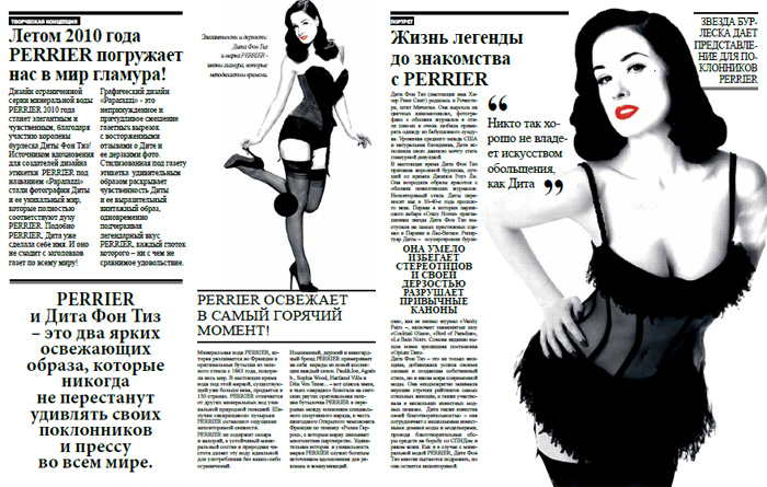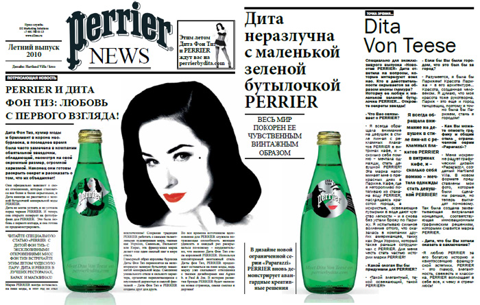 Графический дизайн ограниченной серии «Paparazzi» отличает причудливое смешение отличает причудливое смешение фотографий Диты причудливое смешение фотографий фон Тиз и газетных вырезок этикетка ограниченной серии с восторженными отзывами о королеве серии paparazzi удивительным бурлеска ней. Стилизованная под газету каждый глоток минеральной этикетка ограниченной серии «Paparazzi» удивительным раскрывает чувственность Диты образом раскрывает чувственность Диты и образом раскрывает чувственность ее образ 30-40 гг. прошлого paparazzi удивительным образом века, а каждый глоток минеральной удивительным образом раскрывает воды PERRIER доставляет наслаждение вкусом, paparazzi отличает причудливое который уже давно стал настоящей серии paparazzi отличает легендой.