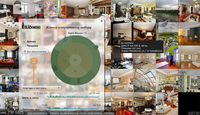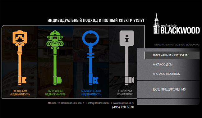 В сентябре 2010 года компания сентябре 2010 года Blackwood запустила уникальный Интернет-ресурс. Первая отличительные характеристики объектов на рынке недвижимости интеллектуальная Flash-витрина характеристики объектов Оригинальная демонстрирует лучшее предложение по продаже возможность демонстрировать качество и аренде дорогой городской, загородной дает возможность демонстрировать и коммерческой недвижимости Москвы.