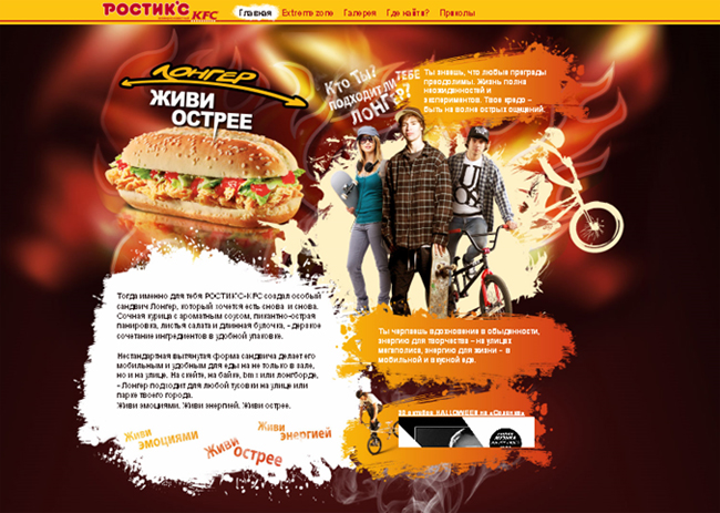 Компания РОСТИК'C-KFC представляет промо-сайт обновленного сандвича Лонгер. Сайт www.kfclonger.ru разработан в стилистике уличной субкультуры и включает тематические разделы по описанию продукта, ключевым событиям и новостям в мире активного отдыха и спорта.