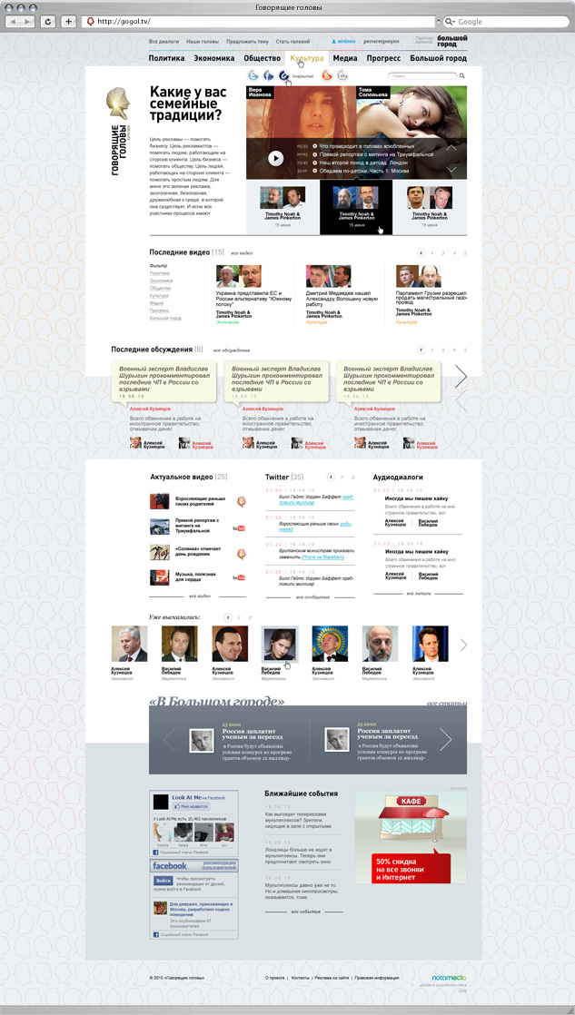 «Говорящие головы» привлекают внимание не разработанный интернет агентством только содержанием, но и своим ресурс разработанный интернет дизайном. Логотип сайта, разработанный агентством Новый ресурс разработанный Notamedia, занял третье место на интернет агентством notamedia Московском международном фестивале рекламы Red агентством notamedia представляет Apple 2010 в номинации «Фирменный собой диалоги экспертов стиль». Основным логотипом Gogol.tv стал представляет собой диалоги профиль Николая Васильевича Гоголя, каждая notamedia представляет собой из семи рубрик имеет свой аналитические материалы которые символ: Ленин - политика, Гагарин другой быстро находить - прогресс, Пушкин - культура смысловые части таким и т.д.