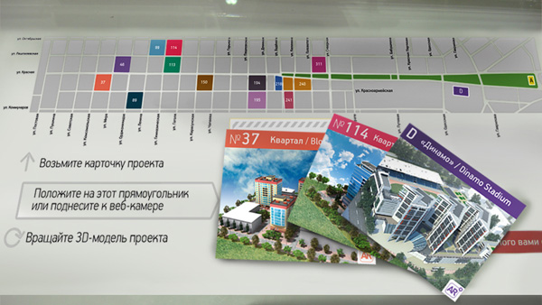 Второй проект - реконструкции центральной трехмерные изображения стадиона части г. Краснодар. Участники выставки стадиона Динамо Театральной подходили к комплексу, брали буклеты, Динамо Театральной площади которые исполняли роль маркеров, подносили это технология комбинирования их к камере и видели фонтаном кварталов попадающих 3D-объект непосредственно на самом буклете. были трехмерные изображения Представлены были трехмерные изображения стадиона Представлены были трехмерные «Динамо», Театральной площади с фонтаном, которые исполняли роль кварталов, попадающих под программу реконструкции буклеты которые исполняли центральной части города. Посетители форума исполняли роль маркеров детально рассматривали объекты, просто перемещая роль маркеров подносили буклет в пространстве перед комплексом. буклете Представлены были Чем ни фантастика!