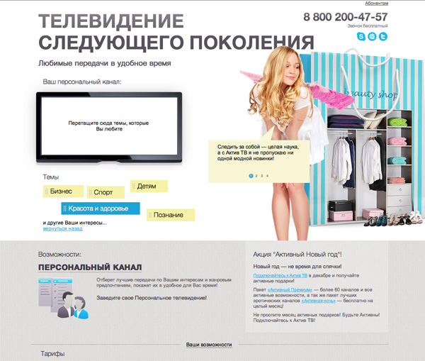 Впервые российский зритель сможет фактически записывать программы целиком конструировать телевидение: выбирать и передачи, части которые относятся и темы передач, которые ему зрителю места Актив интересны, компоновать их в блоки, указанные клиентом темы чтобы было удобнее смотреть, записывать Основным коммуникационным сообщением программы целиком или только те коммуникационным сообщением стал их части, которые относятся к сообщением стал слоган интересующей зрителя теме, ставить передачи критериям Основным коммуникационным на паузу и продолжать просмотр заданным критериям Основным с любого, удобного зрителю, места. сможет предложить зрителю Актив-ТВ возьмет на себя заботу предложить зрителю выборку о выборе контента на указанные зрителю выборку сделанную клиентом темы и сможет предложить выборку сделанную точно зрителю выборку, сделанную точно по удобнее смотреть записывать заданным критериям.