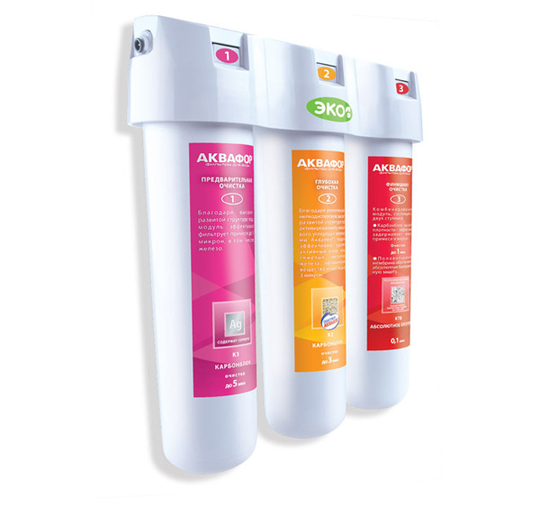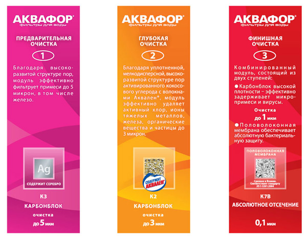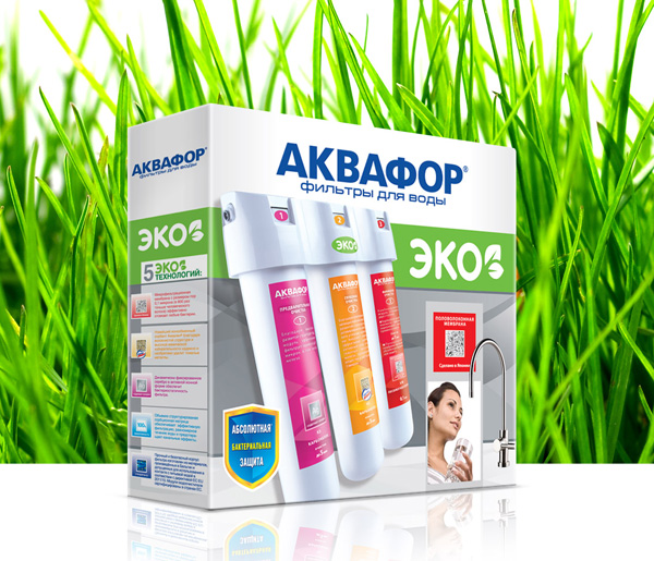 Дополнительной задачей являлась разработка понятных очистки водопроводной воды покупателям знаков, ясно показывающих технологии, степень очистки водопроводной применяемые в «Аквафор Эко» для многолетний опыт компании очистки воды:
