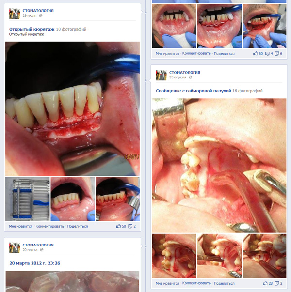 Целесообразно ли размещать на публичной странице, на которую может зайти любой пользователь, информацию, носящую явно специфический характер? После этих кадров желающих обратиться к дантисту явно не прибавится. Очевидно, информацию такого рода лучше выносить «за скобки» и не шокировать случайного посетителя страницы.