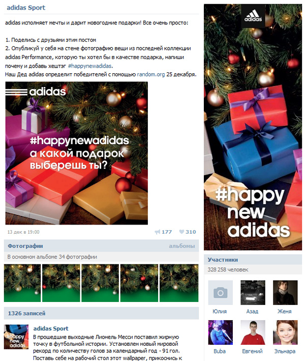 Примеры завлекающих новогодних конкурсов. Простая механика, предполагающая возможность выиграть ценный приз за вступление в группу. Это только начальный этап взаимодействия с пользователем - в дальнейшем компания должна обеспечить сохранение вовлеченности через интересный и полезный контент.