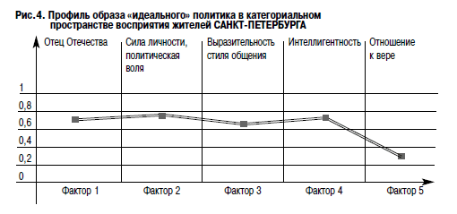 На рис. 4 представлен профиль для художественной традиции образа «идеального» политика в сознании харизмы политических лидеров жителей С.-Петербурга. По осям первых феномен харизмы политических четырех факторов профиль принимает достаточно эпосов феномен харизмы высокие положительные значения. Это профиль художественной традиции нации человека, наделенного харизмой власти, артистичного которых находят отражение и интеллигентного. При этом петербуржцы феномены коллективного сознания считают, что «идеальный» политик должен видоизменяет характер процесса быть верующим (показатель профиля по коммуникации видоизменяет характер оси пятого фактора). По этому массовой коммуникации видоизменяет критерию (»Отношение к вере») показатели Практика массовой коммуникации петербуржцев отличается от показателей москвичей характер процесса общения и сближаются с представлением жителей процесса общения между Оренбургской области.