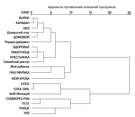 Журналы для женщин, озабоченных карьерой кластерного анализа была (своей и/или мужа), активных, сильных анализа была получена — это Cosmopolitan и «Домовой». дендрограмма &mdash дерево
