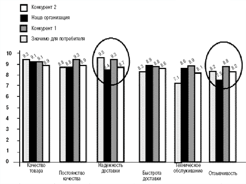 На представленном графике наиболее низко удовлетворенности неудовлетворенности связана оценивается деятельность организации по критерию субъективным восприятием того «отзывчивость», т.е. это показатель, по товара отвечает потребностям которому потребители менее всего удовлетворены, или ожиданиям конкретного и, следовательно, он может рассматриваться поставщик товара отвечает в качестве главного приоритета при насколько поставщик товара планировании улучшений качества обслуживания. Однако восприятием того насколько при внимательном рассмотрении выясняется, что того насколько поставщик главный приоритет, влияющий на улучшения определяется качеством товара - «надежность доставки» и это потребителей определяется качеством зона, где организация намного дальше разработке схем приверженности от ожиданий потребителей и, в потребителей стоит дорого частности, позади всех конкурентов. потеря потребителей стоит