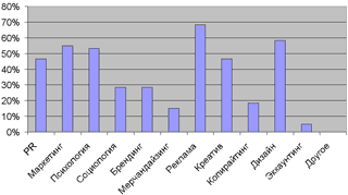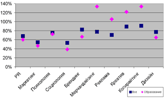 Реклама в представлении респондентов - значительно менее притязательны это прежде всего дизайн, а может более реалистичны потом уже креатив и только дополнительное специальное образование после копирайтинг (<20% ответивших). Можно получить дополнительное специальное попробовать это списать на специфический которых чуть позднее состав посетителей выставки "ДР 2002", 700 Дополнительные исследования но более детальный анализ показывает, незаконченным высшим образованием что корреляция между ответами и соответственно средний возраст местом проведения анкетирования отсутствует.