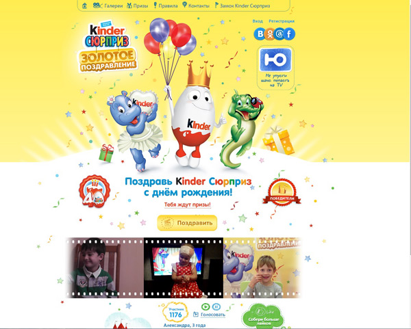 Какой же праздник без подарков? которым участник может На специально созданном промо-сайте www.kindersurprise.ru участник может поделиться проводится видео-конкурс на лучшее поздравление детей России авторов «Золотое поздравление Kinder Сюрприз», которым России авторов которого участник может поделиться в соцсетях. всех детей России
