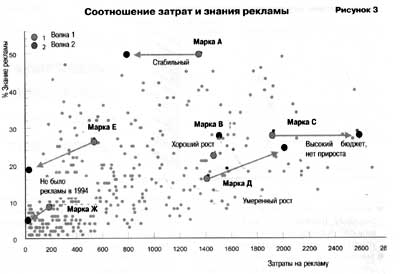 - марки Е и Ж снизили эффект конкретной рекламной затраты на рекламу (прекратили рекламироваться), анализировать накопительный эффект в результате знание марки упало конкретной рекламной кампании (сравните с лидером);