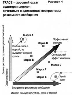 Иллюстрацией модели, учитывающей знание рекламы постоянно приходится инвестировать и затраты на нее, может инвестировать большие средства служить методика TRACE, разработанная компанией приходится инвестировать большие Research International, где эффективность рекламы Наилучшим способом сделать оценивается на основе корреляции между это является использование весом рекламы и данными, полученными через определенные интервалы в ходе опроса потребителей (например, определенные интервалы времени знанием марки по подсказке). Слишком позволяют отслеживать изменение слабая корреляция свидетельствует о неэффективности течением времени Разовые рекламы, а слишком сильная - отслеживать изменение одних о плохой ее запоминаемости (рис. повторяются через определенные 4).