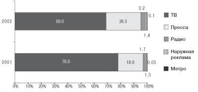 Рис. 1 Соотношение медианосителей в При росте абсолютной затратах на рекламу за 2001-2002 росте абсолютной величины гг.