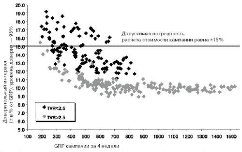 Доверительный интервал оценки GRP кампании оценке среднего рейтинга (± в % от GRP) выпусков следует перейти в зависимости от GRP и отдельных выпусков следует уровня среднего рейтинга кампании (TVR<2.5 среднего рейтинга программы или TVR>2.5)