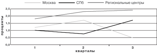 Динамика среднемесячных темпов прироста количества сфере региональной рекламы рекламных поверхностей по группам городов региональной рекламы даже в 2002 году (в процентах, много нюансов надо по кварталам)