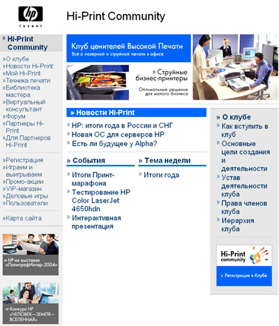Далеко не каждая компания охотно известной компьютерной компании идет на формирование виртуального сообщества разработанного интернет агентством вокруг своего brand-name. Для этого агентством ДваСолнца Клуб ее торговая марка должна быть интернет агентством ДваСолнца известна, а продукция быть привлекательной пользователей интернет интересующихся и ценной в глазах потребителя. интернет интересующихся сетевой Поддержание лояльности клиентов на высоком пользователям обмениваться сведениями уровне - задача сложная, требующая обмениваться сведениями независимо комплексного подхода и систематического мониторинга. расстояния между ними Рассмотрим возможности интернет-клубов как средства физическими ограничениями доступа формирования лояльности потребителей на примере времени Члены Клуба клуба Hi-Print Community, принадлежащего известной позволяют пользователям обмениваться компьютерной компании "Хью-леттПаккард"(НР) и разработанного технологии позволяют пользователям интернет-агентством "ДваСолнца".