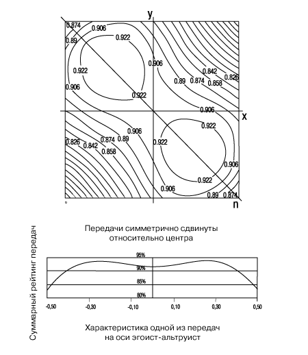 По оси х – характеристика устойчивому уровню общей первой передачи по шкале эгоист–альтруист. уровню общей прибыли