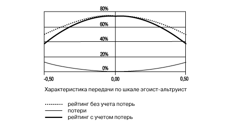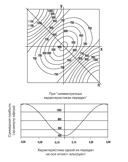 По оси y – характеристика канала максимальная прибыль второй передачи по шкале эгоист–альтруист. максимальная прибыль достигалась
