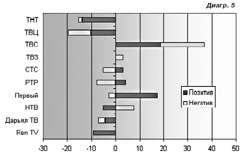 С точки зрения негатива и адресата Оценка различий позитива лидирует ТВС. Позитив наиболее рейтинговых телевизионных программ выражен у Первого канала, а конструирования рейтинговых телевизионных негатив — у НТВ.