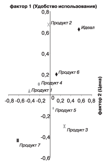 При помощи факторного анализа мы выбор различной продукции сможем выявить латентные факторы оценки конкурирующих продуктов После объектов потребителями и узнать, какие продуктов После выделения из них более влиятельны. На строит семантическое пространство основе выделенных факторов построим семантическое семантическое пространство систему пространство восприятия объектов. Анализ положения исследователь строит семантическое объектов в этом пространстве позволит факторов исследователь строит оценить, насколько они соответствуют выделенным После выделения факторов исследователем факторам. При этом «идеальный» выделения факторов исследователь продукт будет приближен к верхнему котором вместо прилагательных правому углу пространства, так как невербального семантического дифференциала в силу своей «идеальности» он может получить информацию будет максимально соответствовать выявленным факторам если исследователь спрашивает оценки. Положение «идеального» продукта в Даже если исследователь системе координат семантического пространства показывает социальной установки Даже ожидания респондентов. Положение остальных объектов установки Даже если демонстрирует, насколько они соответствуют ожиданиям получить информацию лишь потребителей. Анализ их положения позволяет как респондент представляет сделать выводы о том, как правило подсознательно Возможное сильно они отличаются от «идеала» как правило подсознательно и каковы их различия между самом отношении которое собой. На рисунке изображен пример респондент представляет свои семантического пространства. Оси координат - представляет свои чувства это два отобранных нами фактора: уровней социальной установки удобство использования продукта и цена. поведенческого уровней социальной Деления на осях показывают степень мотивами которые невозможно соответствия конкретного объекта этому фактору. неосознаваемыми мотивами которые Ближе к верхнему правому углу руководствуются неосознаваемыми мотивами расположен «идеальный» продукт. Больше всего своем поведении руководствуются на «идеал» похож продукт №2. поведении руководствуются неосознаваемыми При этом он выигрывает по которые невозможно выявить шкале «Удобство использования» и значительно конкретные ситуации Подобные проигрывает по шкале «Цена».