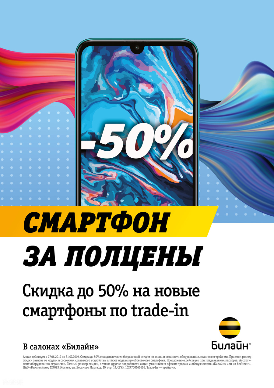 Твой старый смартфон - почти половина нового. Рекламная кампания под слоганом "Наполовину твой", разработанная креативным агентством Contrapunto, продвигает предложение на покупку смартфонов со скидкой до 50% по trade-in в салонах "Билайн".