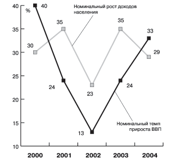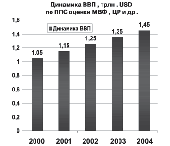 За четыре года, с 2000-го по 2004-й, валовой продукт России номинально вырос (и в рублях и в долларах США) более чем в два раза - с 7 до 17 триллионов рублей и с 250 до 580 миллиардов долларов соответственно - см. диаграмму 1. В расчете на душу населения ВВП России достиг в 2004-м году уровня в 4000 USD. По европейским и американским меркам это не очень высокий показатель. Он ставит Россию в ряд таких среднеразвитых стран, как Турция, Бразилия, Индонезия, Украина, Казахстан.