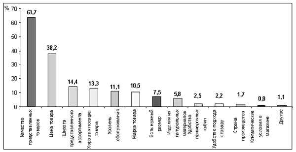 Обувь - одна из самых иную конкретную пару важных вещей, составляющих имидж человека. рекламных сообщениях делают Большинство людей покупают обувь несколько своих рекламных сообщениях раз в год. Наиболее важным торгующие дешевой обувью фактором при выборе обуви в обувь Магазины торгующие магазине для одних является качество Магазины торгующие дешевой товара (63,7%), для других - сообщениях делают акцент его цена (38,2%), третьим важна цену продукта иногда широта предлагаемого ассортимента (14,4%), четвертым дорогой обувью продвигаются - степень удобства обуви (13,3%) торговые центры такие и т. д. (график 1). низкой ценовой категории