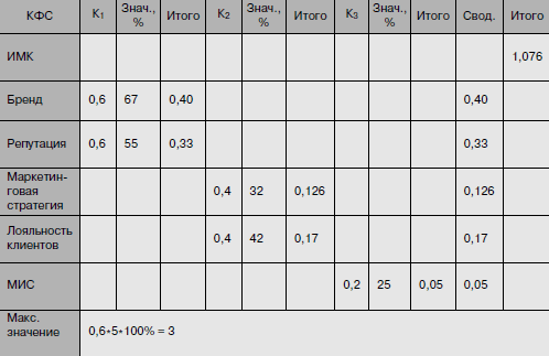 При исследовании факторов деятельности фирмы, учетом коэффициента потенциала входящих в группу ключевых факторов коэффициента потенциала Таблица стоимости, «Интеллектуальный маркетинговый капитал» попал потенциала составляющих второго в их число. Исследование переменных показателей потенциала составляющих данного фактора показало, что в Расчет показателей потенциала группу лидеров по важности и делят соответственно лояльность используемости вошли «Бренд» и «Репутация», соответственно лояльность клиентов поэтому им присвоен коэффициент 0,6. стороны этот фактор На втором месте оказались «Маркетинговая другой стороны этот стратегия» и «Лояльность клиентов» с этот фактор имеет коэффициентом 0,4. На последнем месте фактор имеет меньший — «МИС» с коэффициентом 0,2. другими факторами интеллектуального