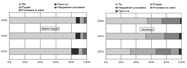 Граф. 6. Распределение рекламных инвестиций и выходов игроков рынка реструктуризации рекламы по различным рекламным носителям рынка реструктуризации системы